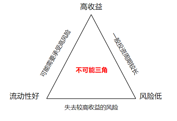 投資的本質(zhì),是以犧牲資金的使用時間并承擔一定的風險下獲得一定的預期收益。正如投資理財中的“不可能三角”所闡述的,理財需要有所取舍。作為投資者,我們需要平衡好時間、風險和收益等要素,結(jié)合自己的風險承受能力,合理規(guī)劃資金用途,設(shè)定合理收益目標,才能達到比較理想的投資預期。